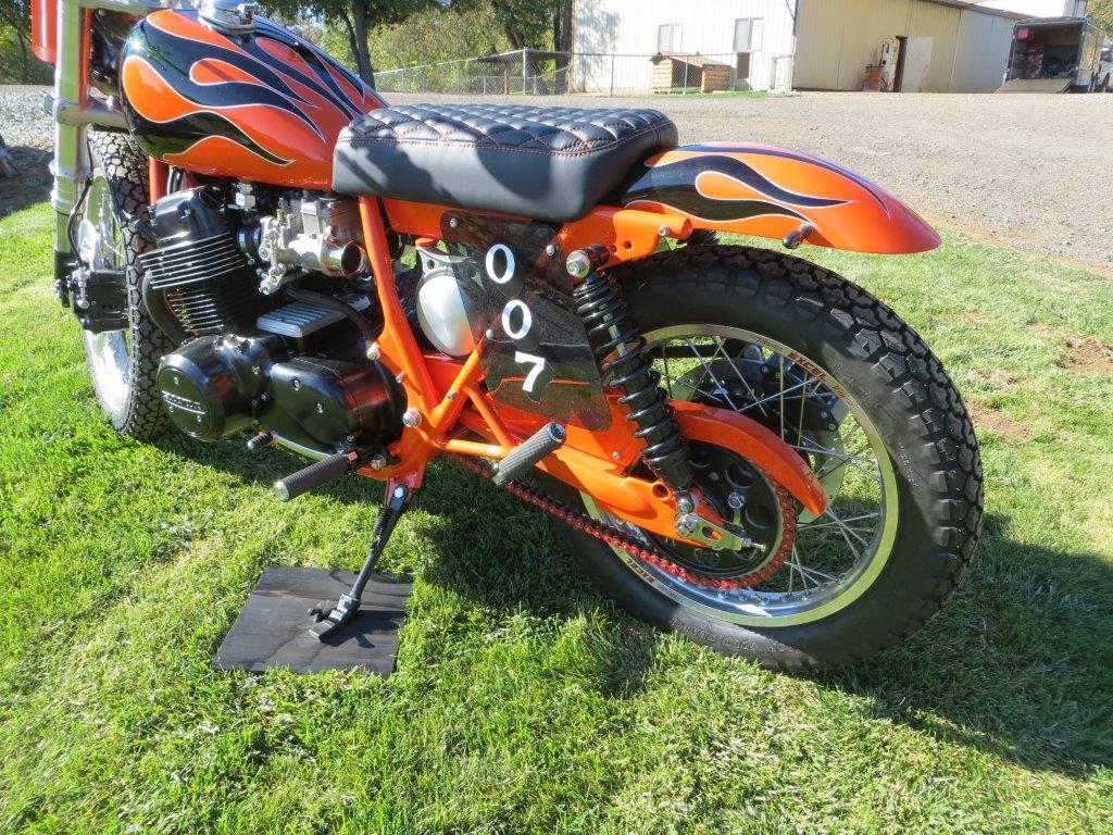 The frame was ground smooth and TIG welded, then ground smooth again and sprayed with Hugger orange epoxy paint. The swing arm was reworked as well, grinding off the ugly ridges and re-welding all the seams. A custom chain guard was then fabricated and mounted to the swing arm.
