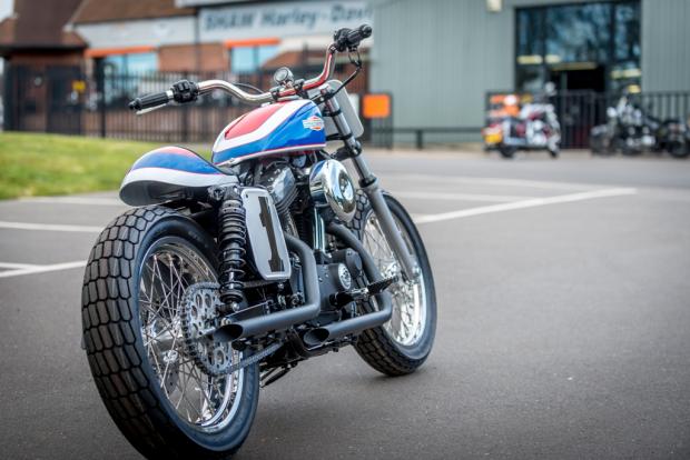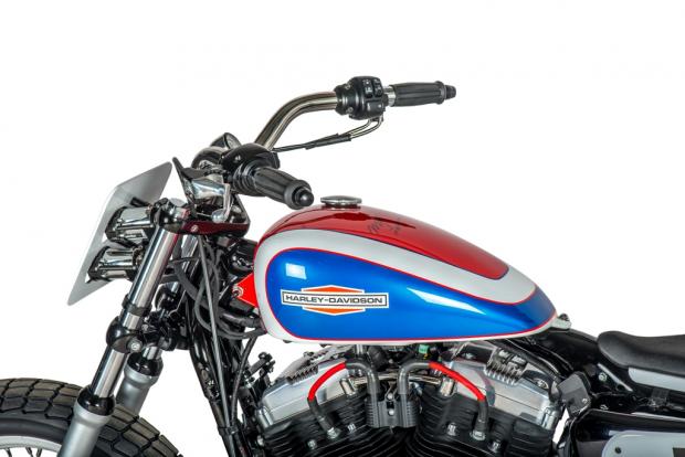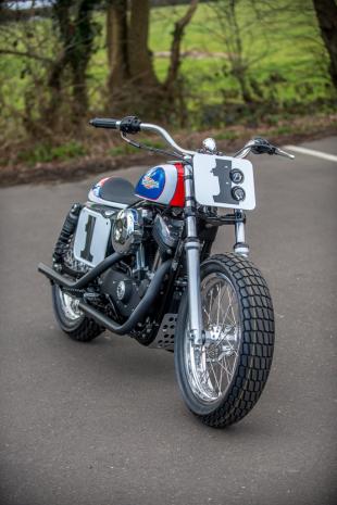 They removed the front brake, the lack of which is an obvious nod to flat track racing. The single headlight has been replaced with a number plate bearing a pair of LEDs, and wide tracker-style bars have been added. The rear fender and stock seat have been removed in favor of a single solo unit.