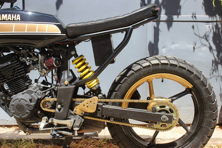 The bike was entirely customized, it has a new frame geometry, fuel tank adapted, custom paint, new tires, LED turning lights front and rear, custom seat, revision of electric system and battery, gold chain and lot of accessories.