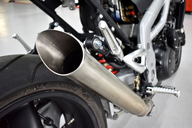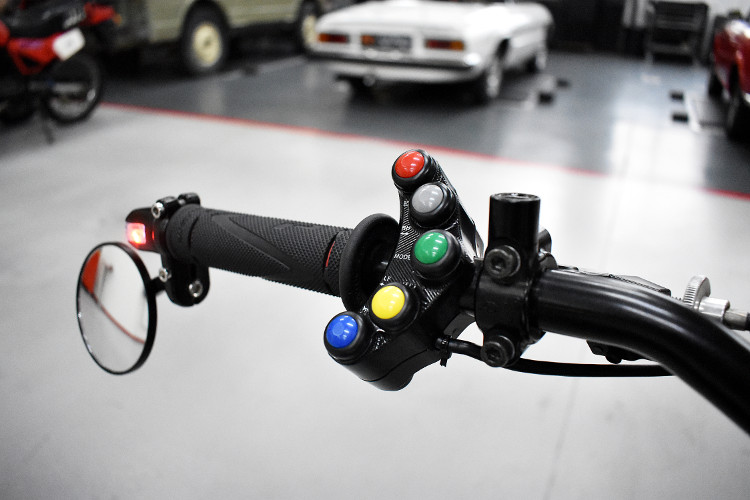 The new black handlebar is higher than the original and hosts the turn signal wiring (mounted at the handlebar extremity). I’ve also mounted rear mirrors in neo-caferacer style and a new command that permits the rider to change the ECU maps from “normal” to “racing”.