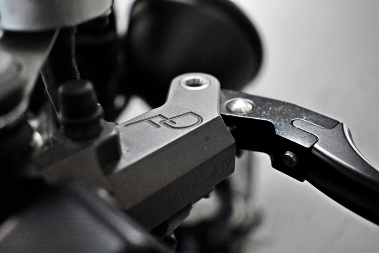 The original chromed lights are now painted in opaque black, and the front number plate is handmade in aluminum. Than I’ve mounted a new radial brake pump that certainly offer better performance: Discacciati 19mm.