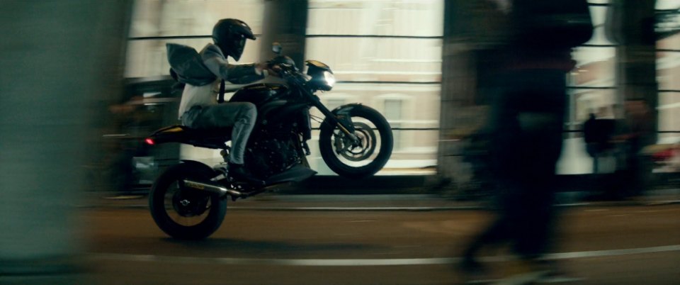 The action scenes are a combination of Ryan — a well-known motorcycle enthusiast — and a stunt double riding the Triumph through the streets of Amsterdam. Said director Patrick Hughes: