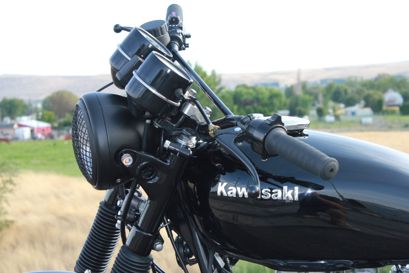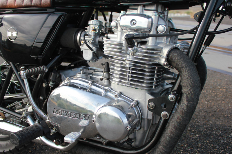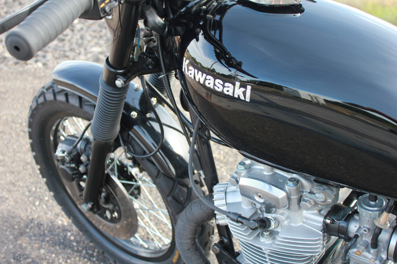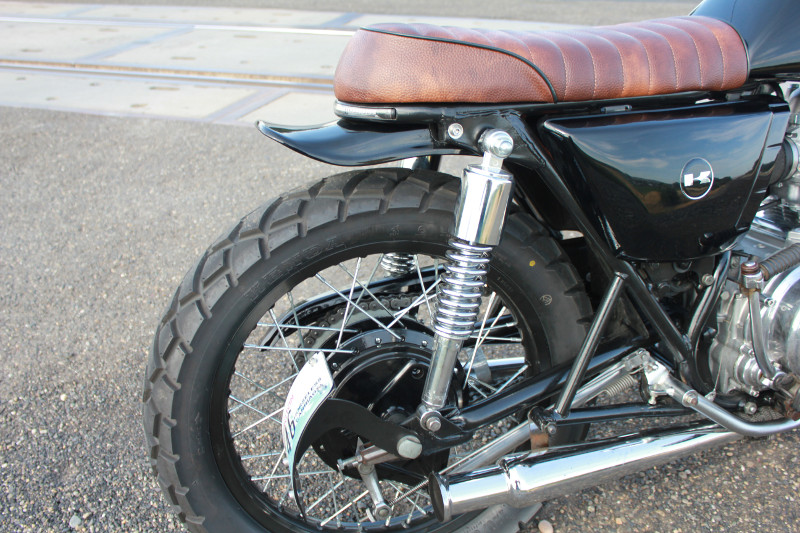 The rear fender was cut so we could reuse the duckbill fender as an iconic sign to vintage Kawasakis of that era as well as having it powder coated with the front forks and headlight brackets. We also raised the rear by fitting an inch and half longer rear shocks to the bike to give us more clearance and an aggressive stance.
