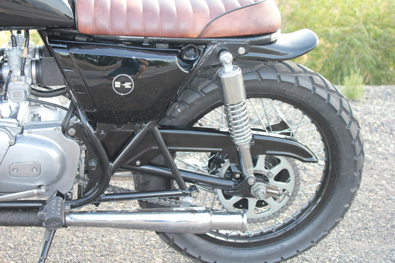 The sub frame was reduced by about a half afoot to add the hoop and flush-mounted LED taillight with integrated blinkers and brat style seat.
