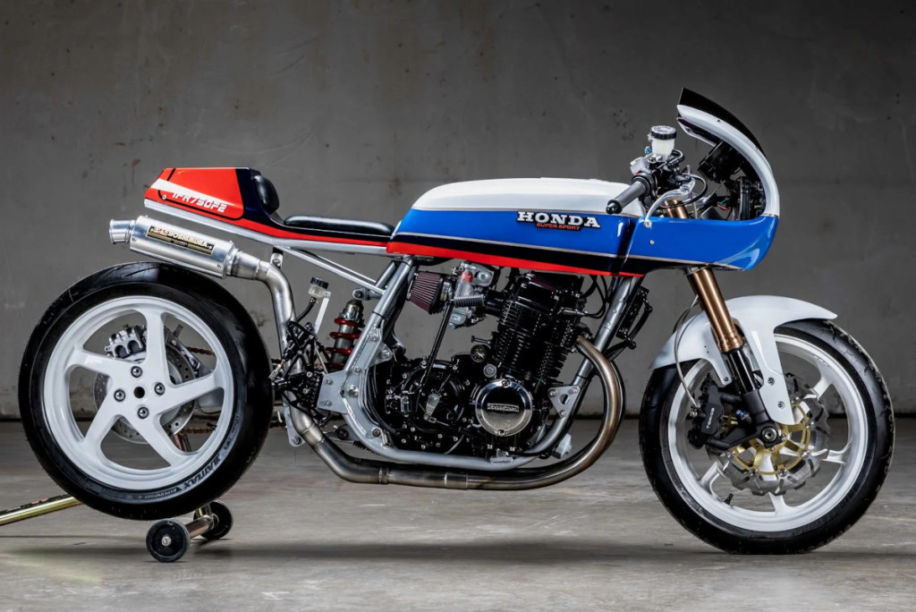This RC30-inspired restomod / frankenstein started as a $100 1978 CB750F2 that Justin saved from the crusher, retrofitting the machine with loads of Honda superbike parts from the 80s and 90s — keeping the bike true to its Honda roots — as well as a built 836cc engine and one-off RC30 style paint scheme.