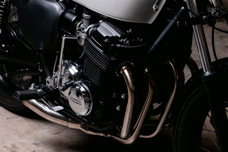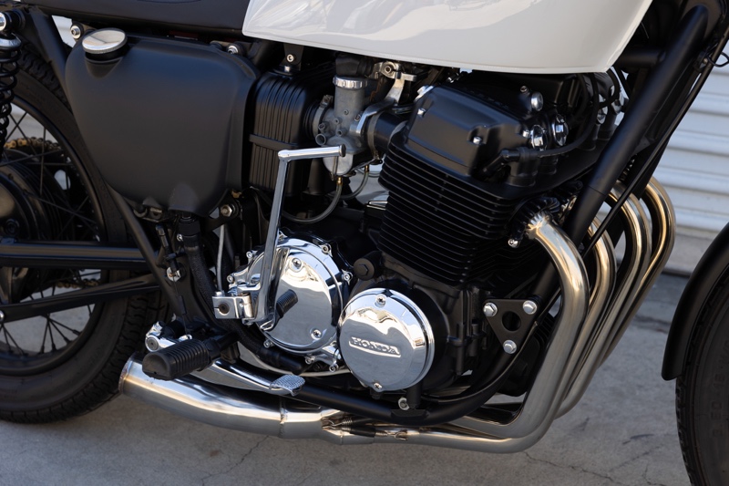 Often when switching to air pods or velocity stacks, there’s a lull in the middle to upper range of the power band. The 4-1 exhaust was modified slightly to keep the tone of the exhaust deep, yet with that signature roar the four cylinder CB750 is known for.