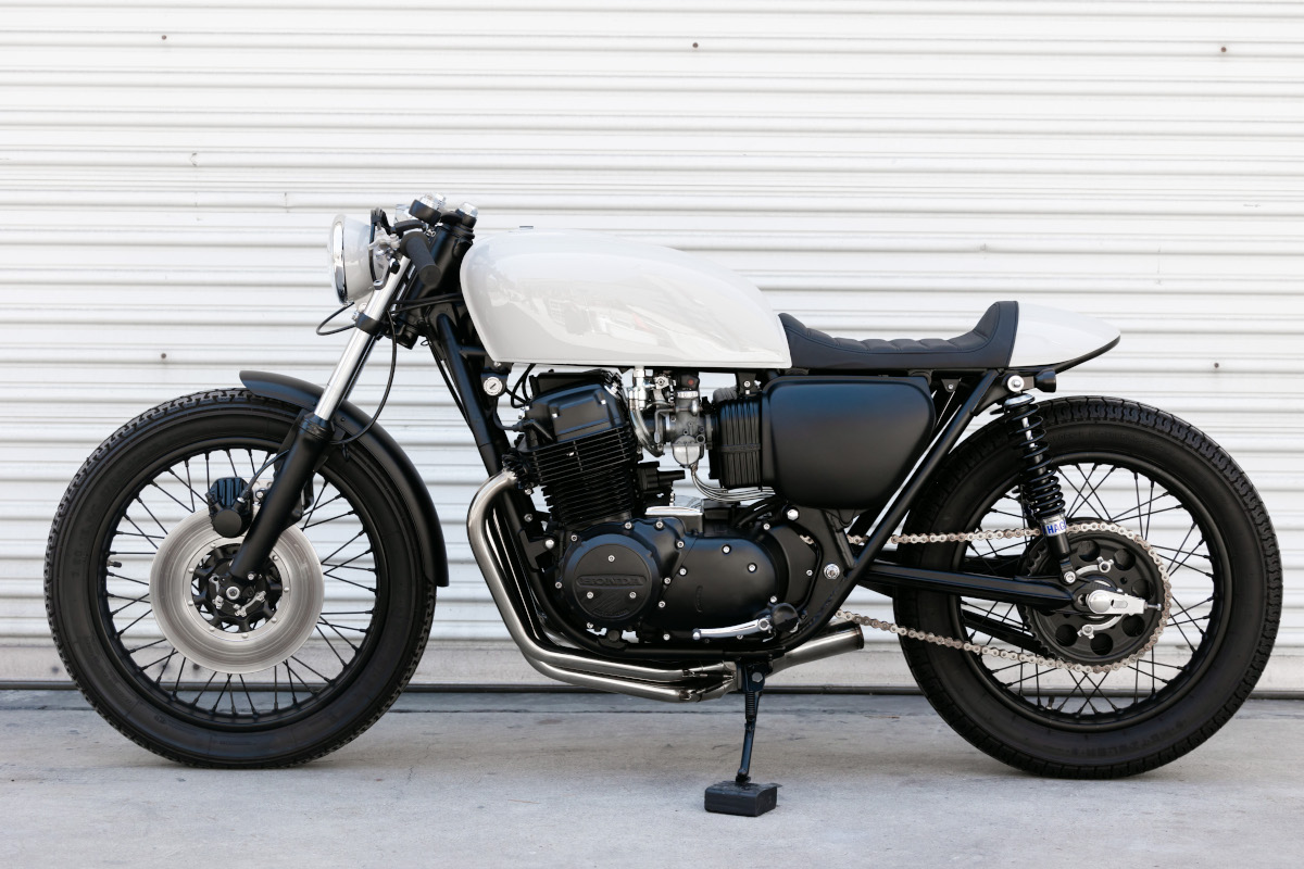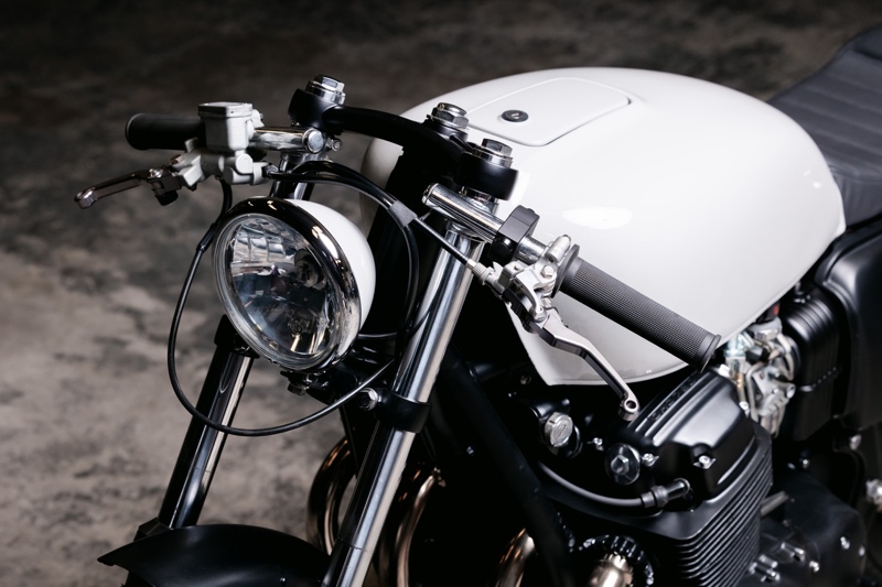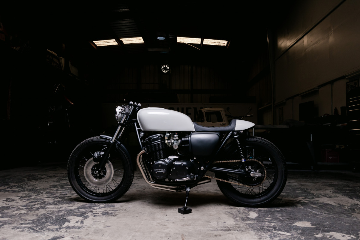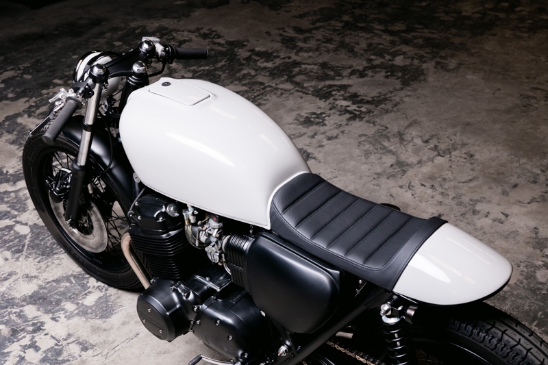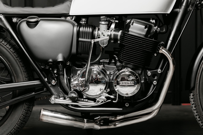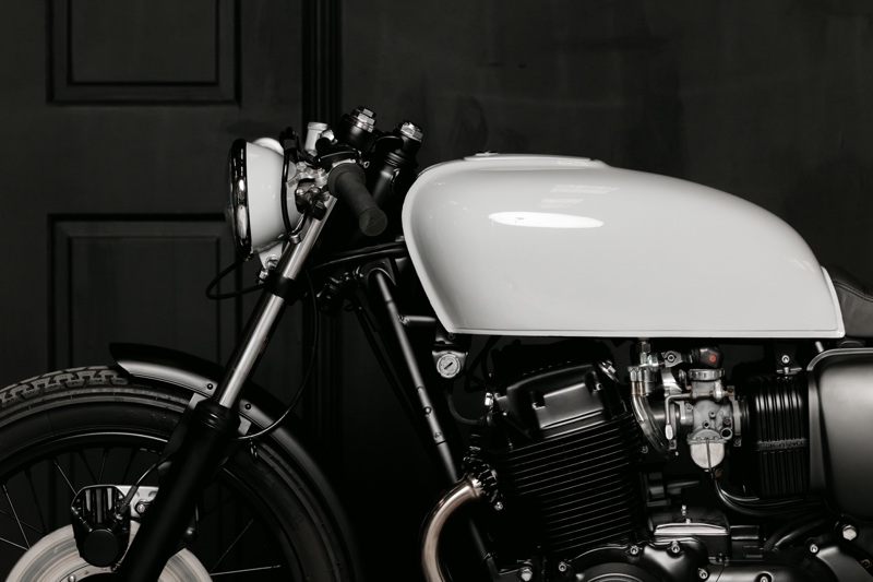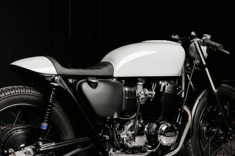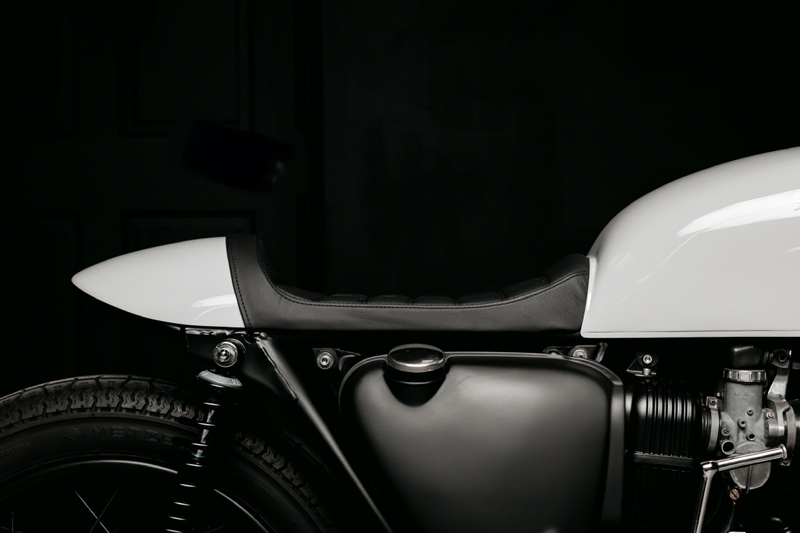 They wanted to highlight the overarching silhouette of the custom aluminum seat cowl, CB550 tank, and headlight — painting them chalk-white to contrast with the lower portions of the bike: