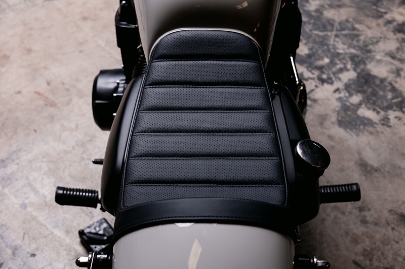 The main focus was to highlight the clean lines and silhouette that the headlight, tank, and seat cowl could produce. Anything under those three elements was painted or powder coated in a matte black to almost give a sense of a shadow under those lines. Our overall style at the shop is to have the builds look as minimalist as possible.