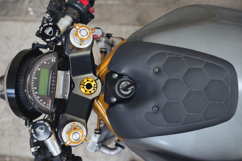 Out back, the ST3 double-sided swingarm has been replaced with the single-sided unit from a Monster S2R, complete with an Öhlins rear shock.