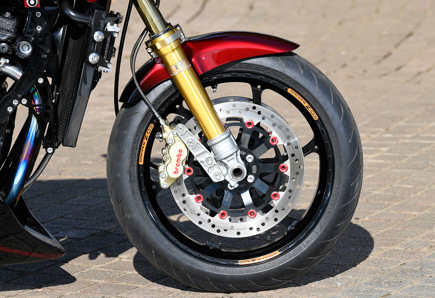 The bike is now rolling on 17-inch OZ Racing Wheels — a GASS 3.50-17 in front and PIEGA 5.50-17 in the rear, matched with a Sculpture swingarm, widened chainline (95mm → 103mm), and Pirelli Diablo rubber. Öhlins suspension and Brembo brakes round out the undercarriage.