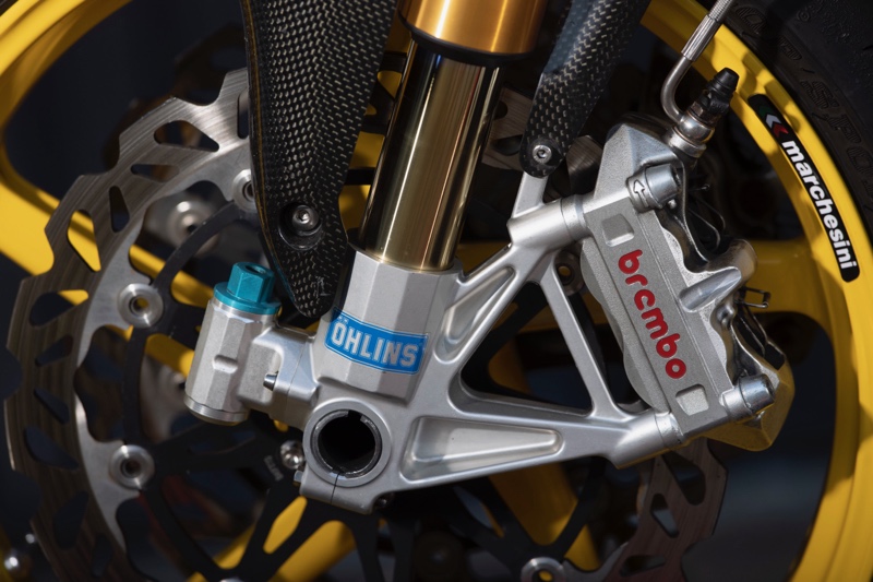 Meanwhile, the frame was braced and decluttered. Up front, there’s an Öhlins front end with billet yokes, while Öhlins rear shocks and a JMC swingarm keep the rear end planted.
