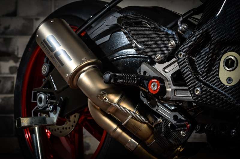 The carbon fiber parts were mounted at same time we got the wheels back in candy chrome red and all the painted parts in Nardo grey. At the same time, we received some special brake and clutch levers, BMW HP foot pegs, etc.