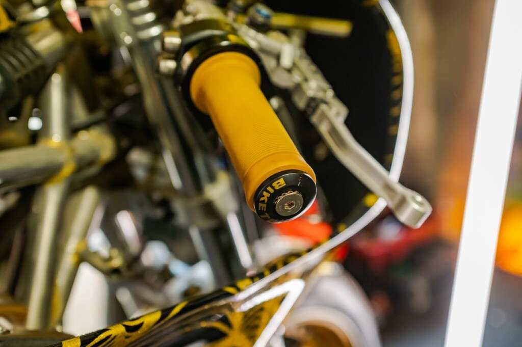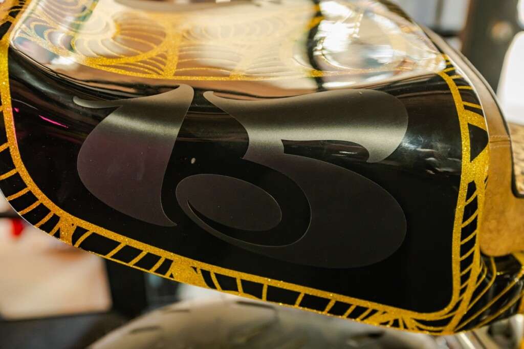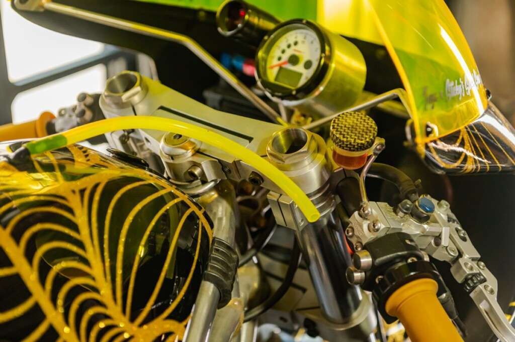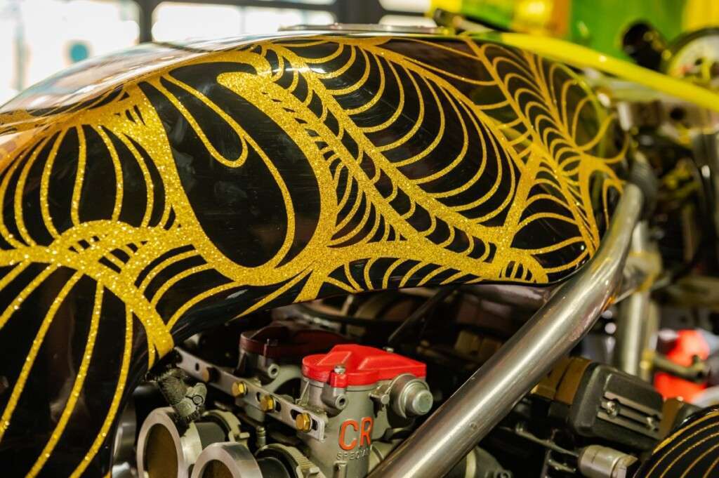 “Goldie” — as Matt has nicknamed the bike for obvious reasons — rolls on a set of ultra-rare British-made Astralite wheels constructed of 5251 aluminum alloy with custom hubs. The exhaust is a custom titanium system, the fairing a modified King Carbon unit, and of course INSA laid down his magic for the design, with Matt’s own Image Worx Ltd providing the paint stencils and stickers. (The “Sticky” name originally came from Matt making stickers.)