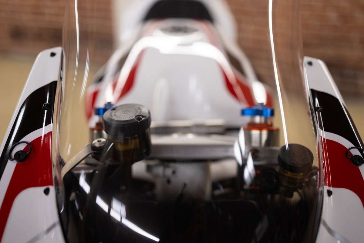 The ECU, previously mounted in the tail, is now housed in the front fairing behind the tachometer and temperature gauge. And the Li-ion battery, starter solenoid and regulator rectifier now reside in the rear subframe. The minimal carbon bodywork from Corsa Garage was modified to offer the rider a simple ½ fairing, and the frame was de-tabbed of superfluous mounting points to clean up the lines.