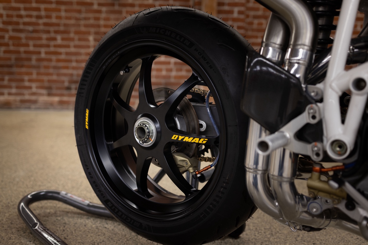 The motor was rebuilt locally with only some light head work to retain long term usability, but we chose to focus the majority of the budget on improving the handling. First by ditching the weighty OE cast wheels in favor of a pair of lightweight Dymag forged aluminum equivalents. Next a Nitron three-way remote adjustable rear shock, a pair of PFM narrow band rotors with six-piston calipers, and a Ducabike slipper clutch replaced their stock counterparts.