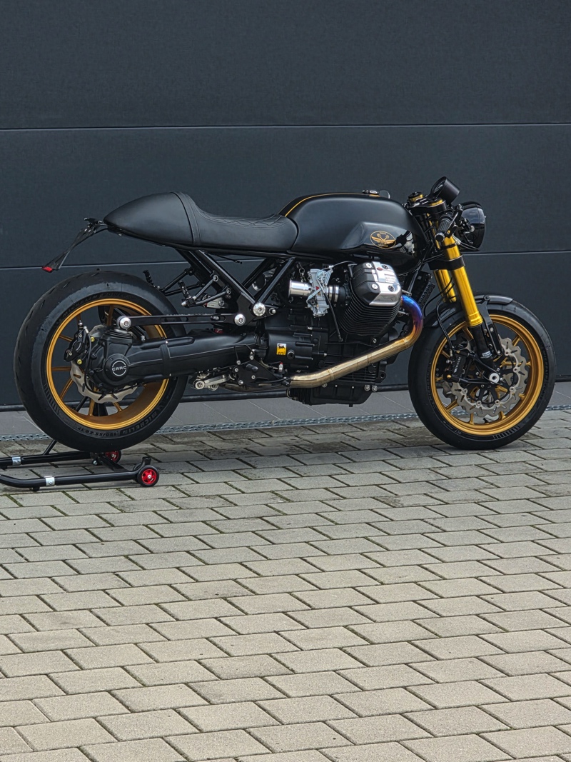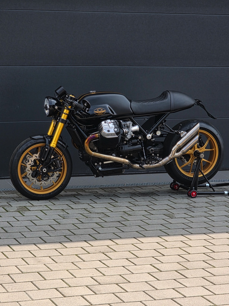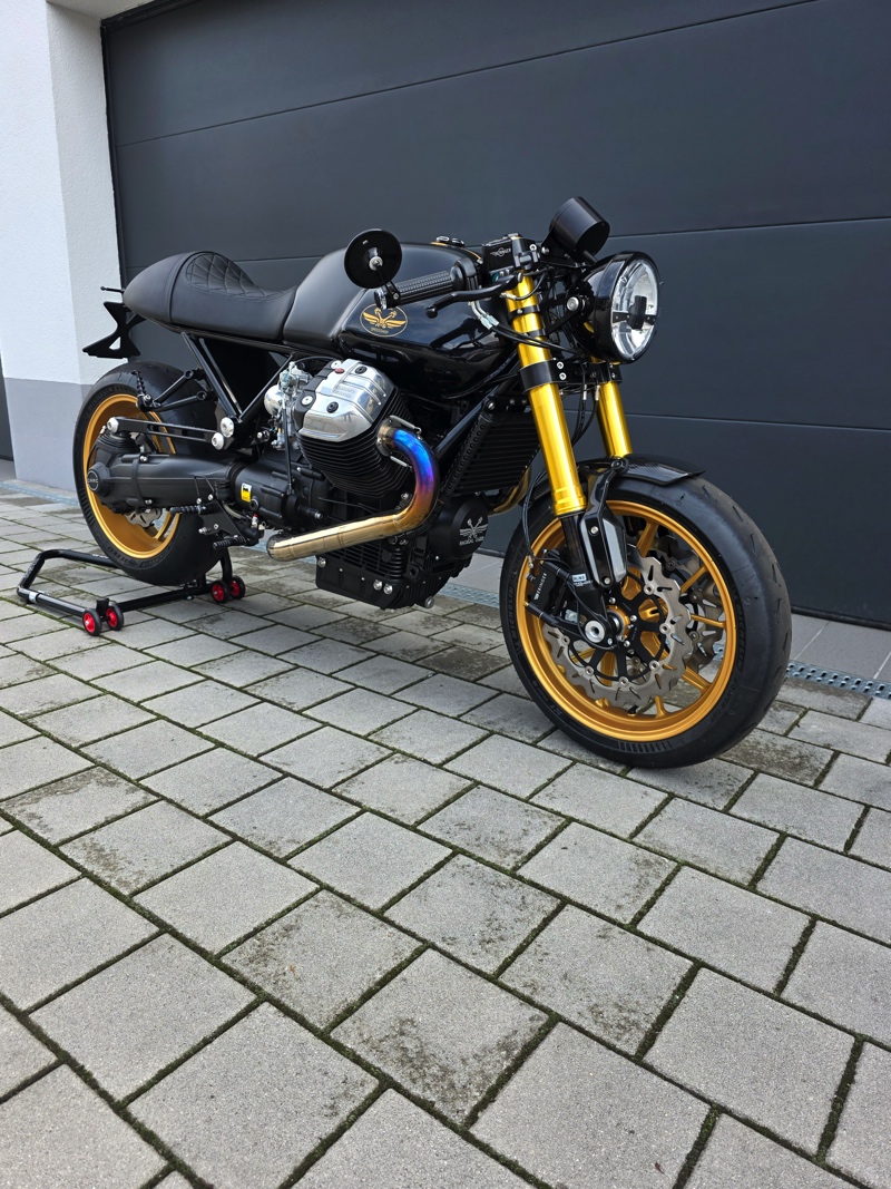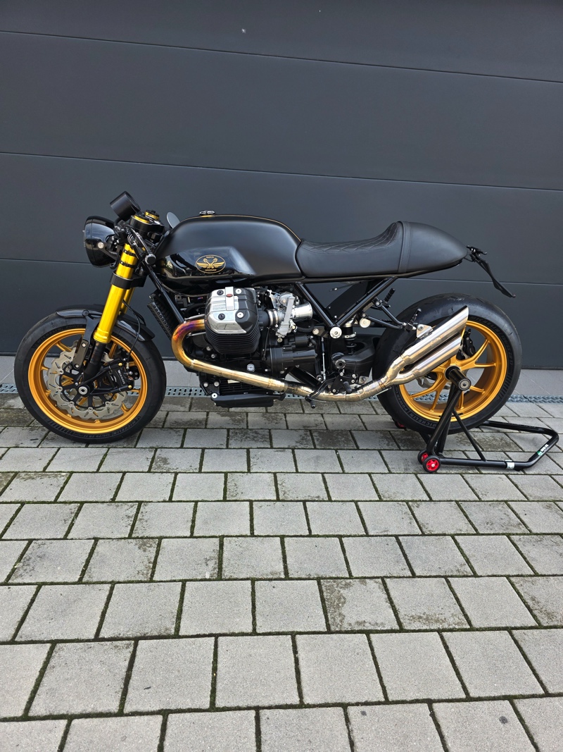 Frame was customized, V7 tank and saddle, upside-down forks, CNC yokes, Ducati wheels, big bore kit, race Cams, 6-speed gearbox (etc…), together few words and 500 hours of work (maybe more …) and incredible skills. I think it’s a completely new motorcycle built. Perfect Motorcycle.