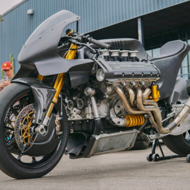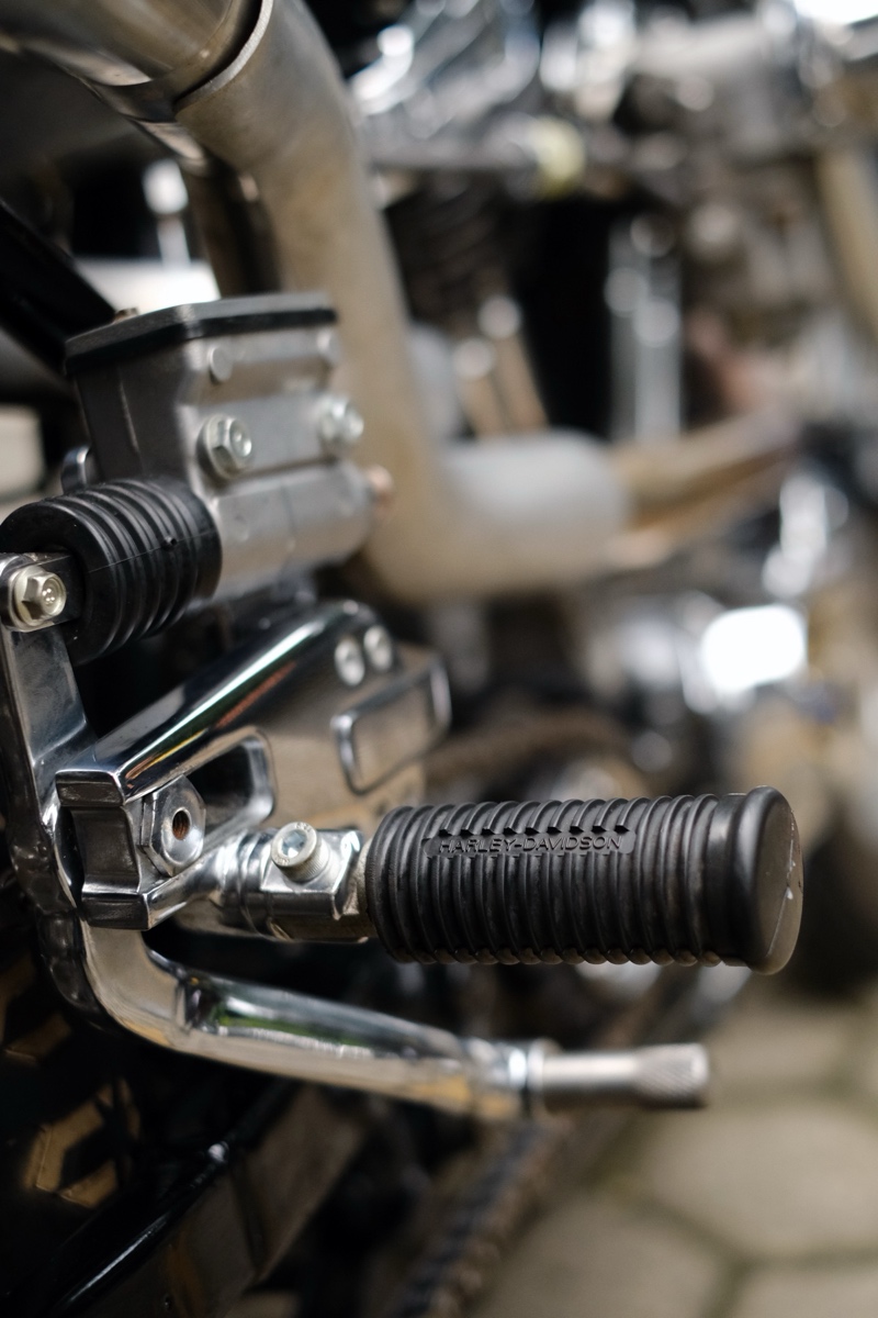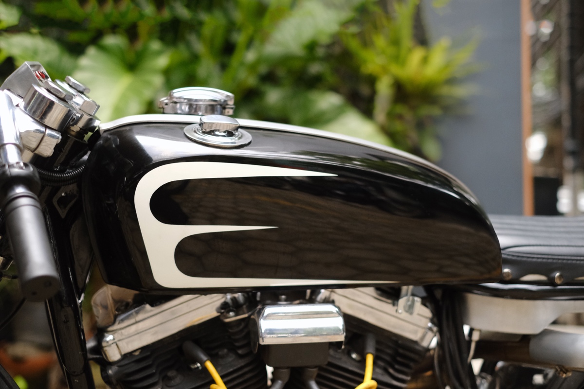 The result is an Evo Sportster that looks like it’s from an earlier era — a bike you might see at a 1950s American dragstrip or sitting beside the 454-powered ’55 Chevy from Two Lane Blacktop. The Holley double-barrel carb and velocity stacks scream hot rod, as does the old-school Hoosier rear tire, one-off gas tank with scallops-style paint, hand-formed tail cowl, and the supremely analog nature of the build. The custom rear-sets were perfectly positioned for the rider’s knees not to interfere with the carb, while heat shielding protects the legs. All in all, this is one of our favorite café-style Sportsters we’ve ever seen — a build that screams American hot rod. Bravo to Kevan and Swadaya workshop for pulling it off so beautifully.