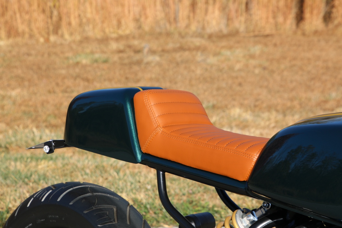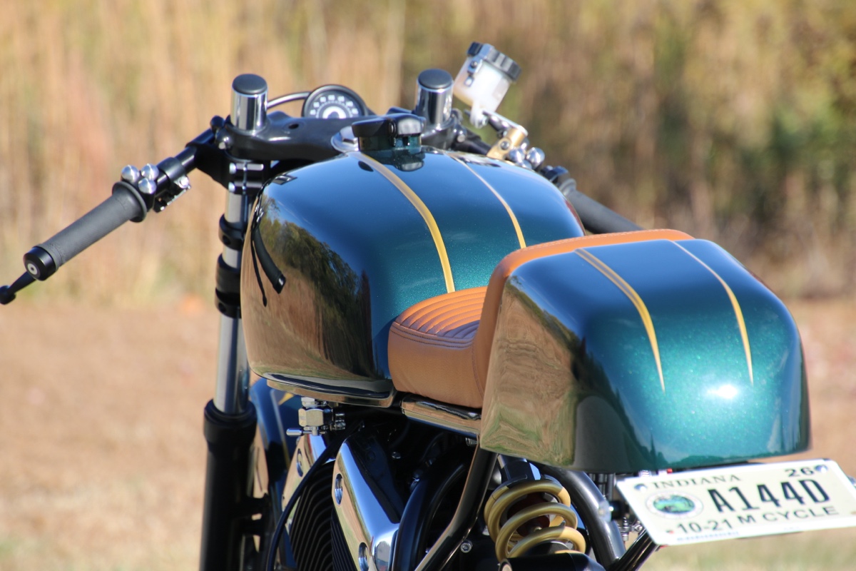 The tank, fender, and rear cowl were all painted Lotus Dark Verdant Green, and a custom gold pearl was mixed for the stripe to tie in with the powder coated rear spring and master cylinder.