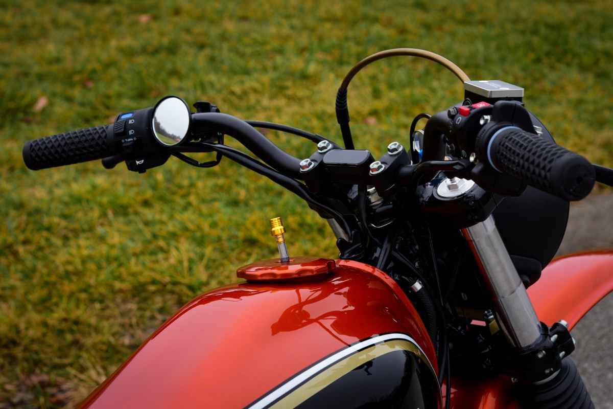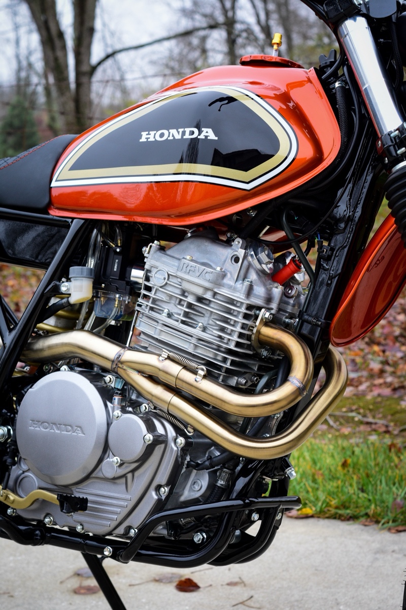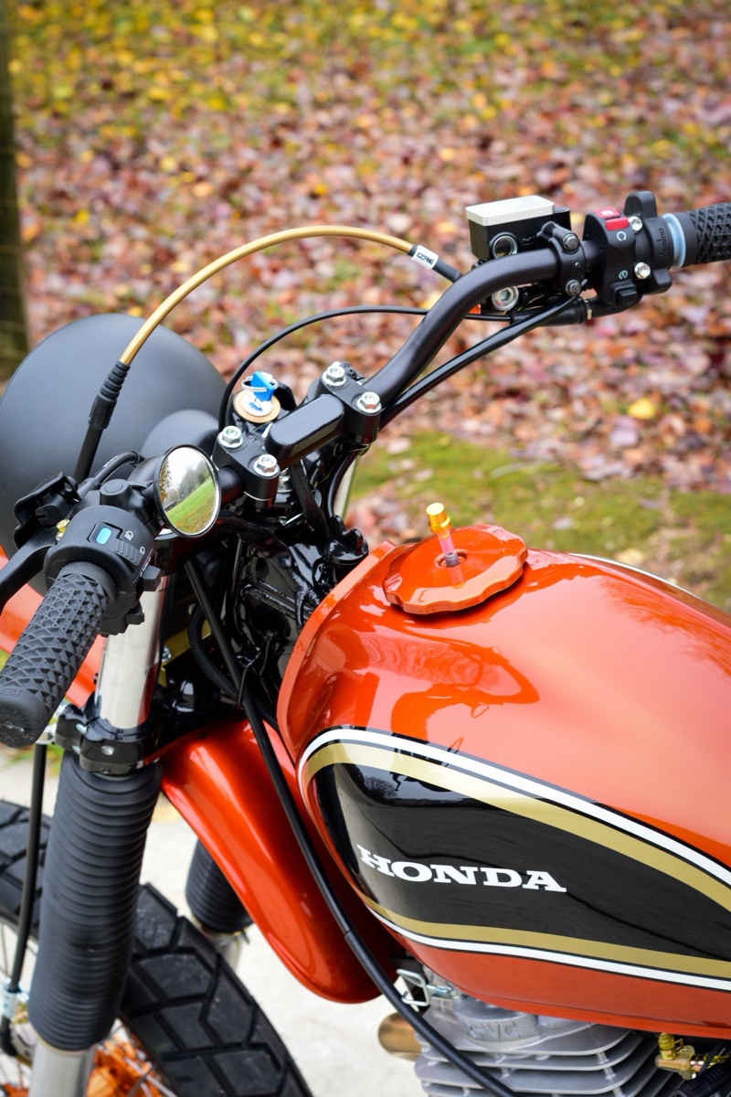 The most important part was the paint. I wanted to make sure I did not build another red and blue Honda, so I used arguably my favorite Honda color, Flake Sunrise Orange. The simple design for the paint was from my favorite Honda CB from the 70’s. In the sun, the flake sparkles just enough! It has to be my favorite part of the bike for sure, so thank you to Hired Guns Paint!