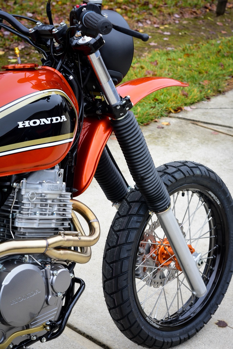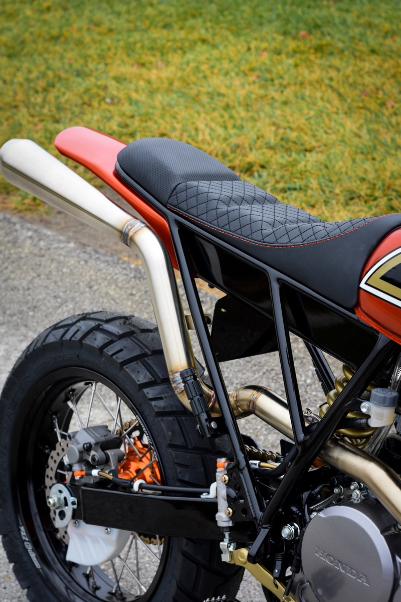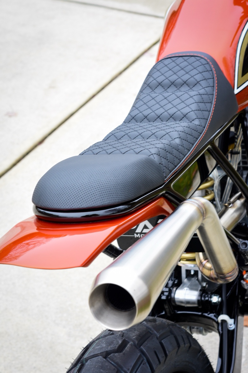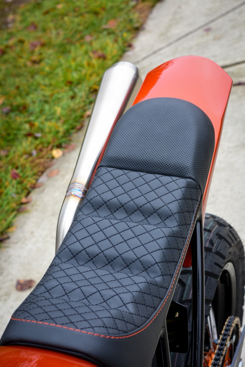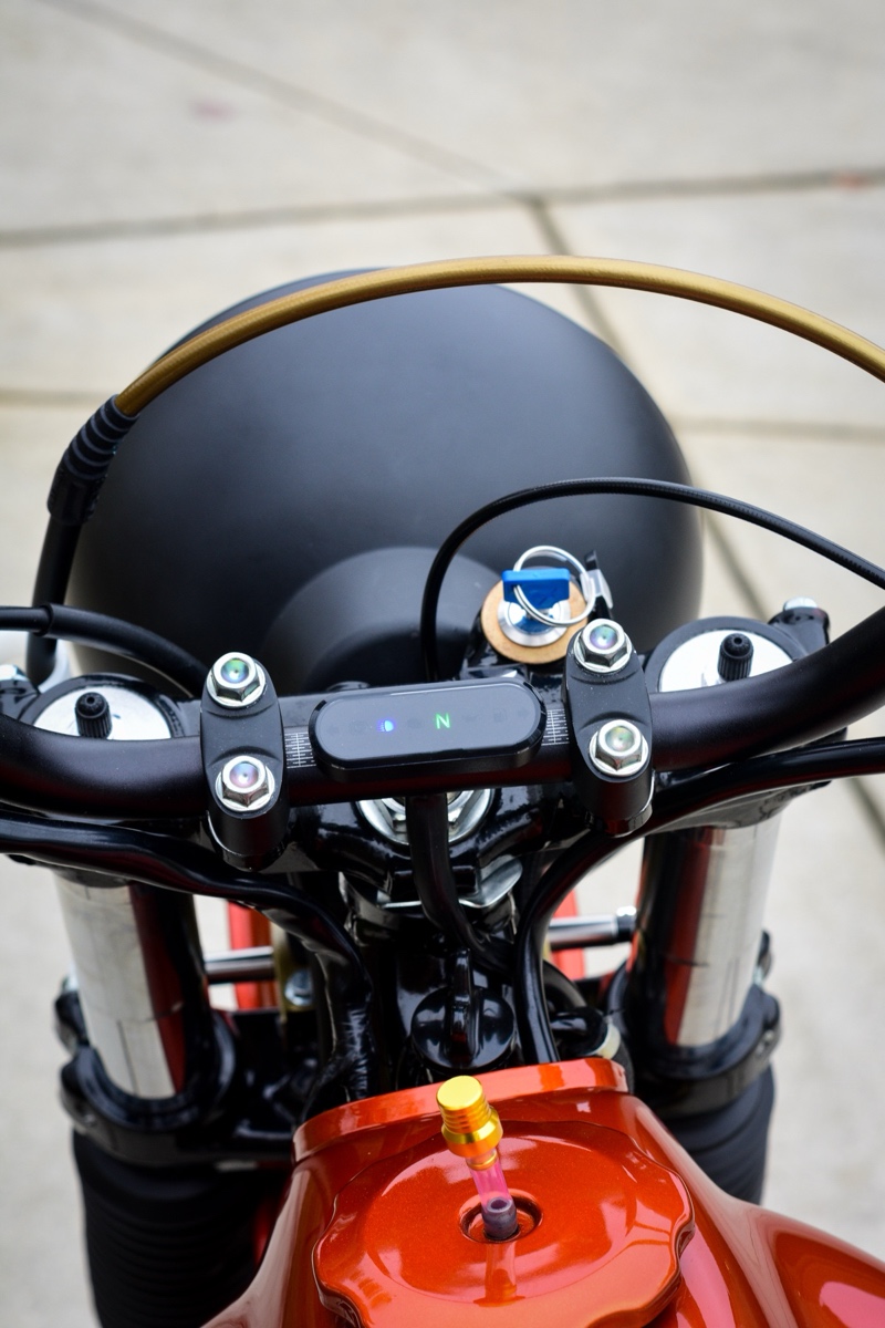 The paint really hits home on the nostalgia front. It’s Honda’s Flake Sunrise Orange, like you’ve seen on many a 70s CB, shot by Hired Guns Paint. The result is a long-legged retromod scrambler that like we wished the factories would build. Fortunately, we have builders like Spencer to make such machines a reality.