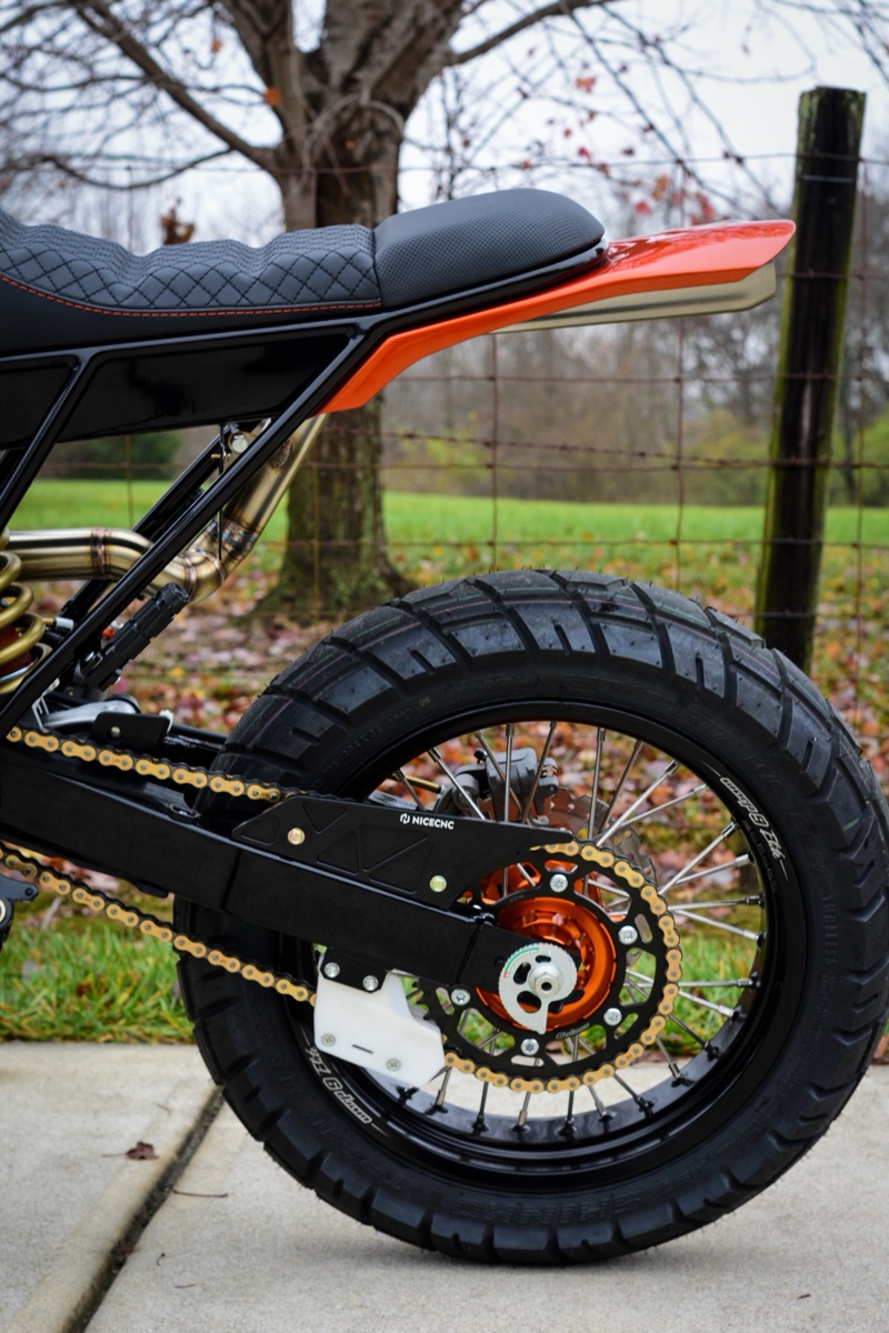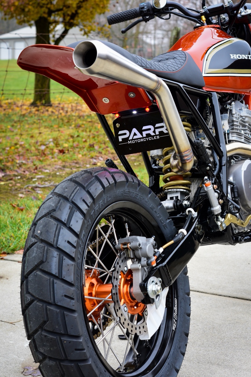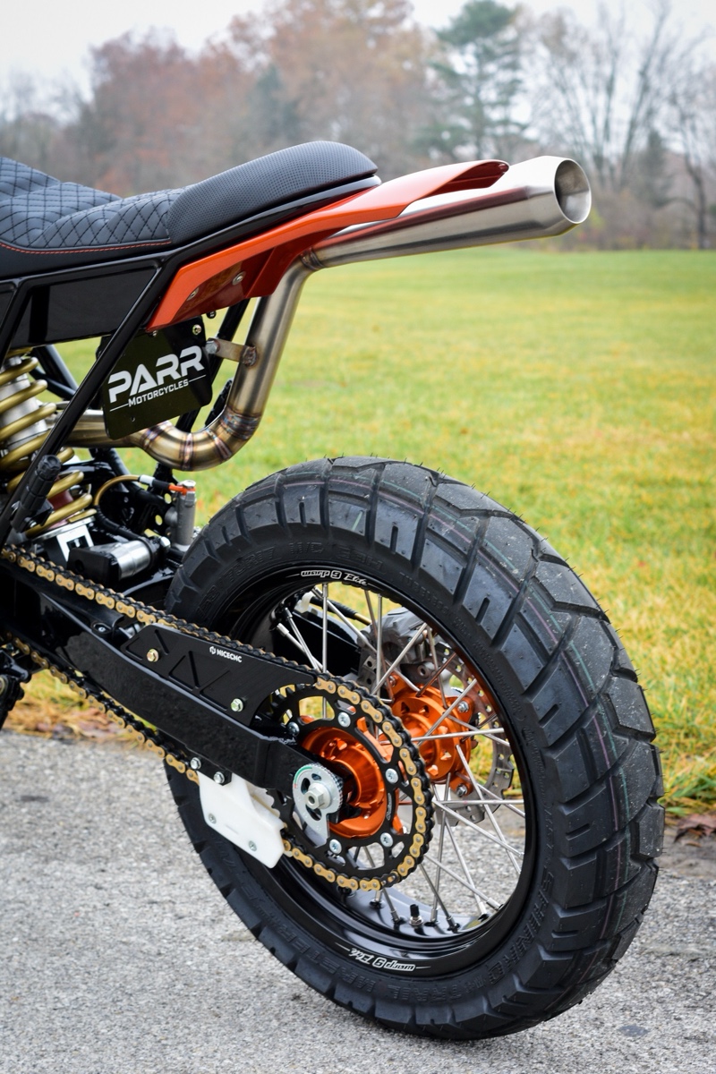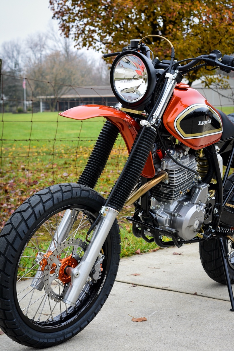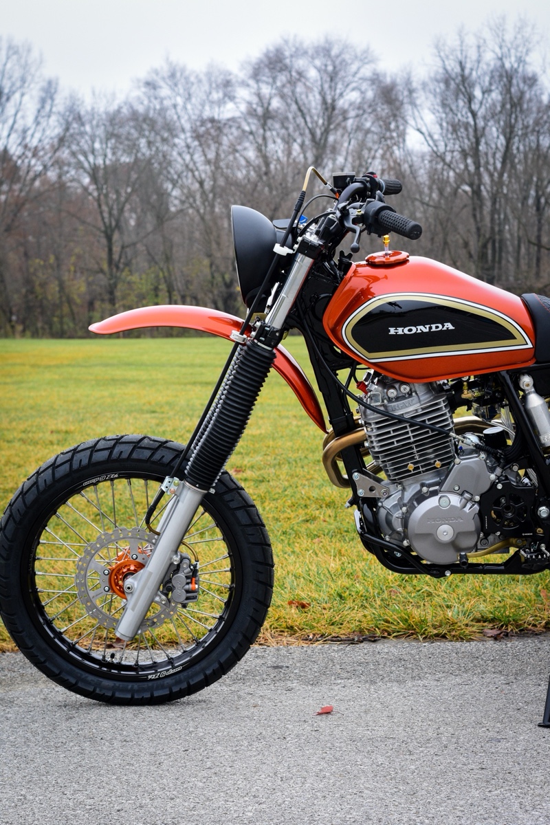 The paint really hits home on the nostalgia front. It’s Honda’s Flake Sunrise Orange, like you’ve seen on many a 70s CB, shot by Hired Guns Paint. The result is a long-legged retromod scrambler that like we wished the factories would build. Fortunately, we have builders like Spencer to make such machines a reality.