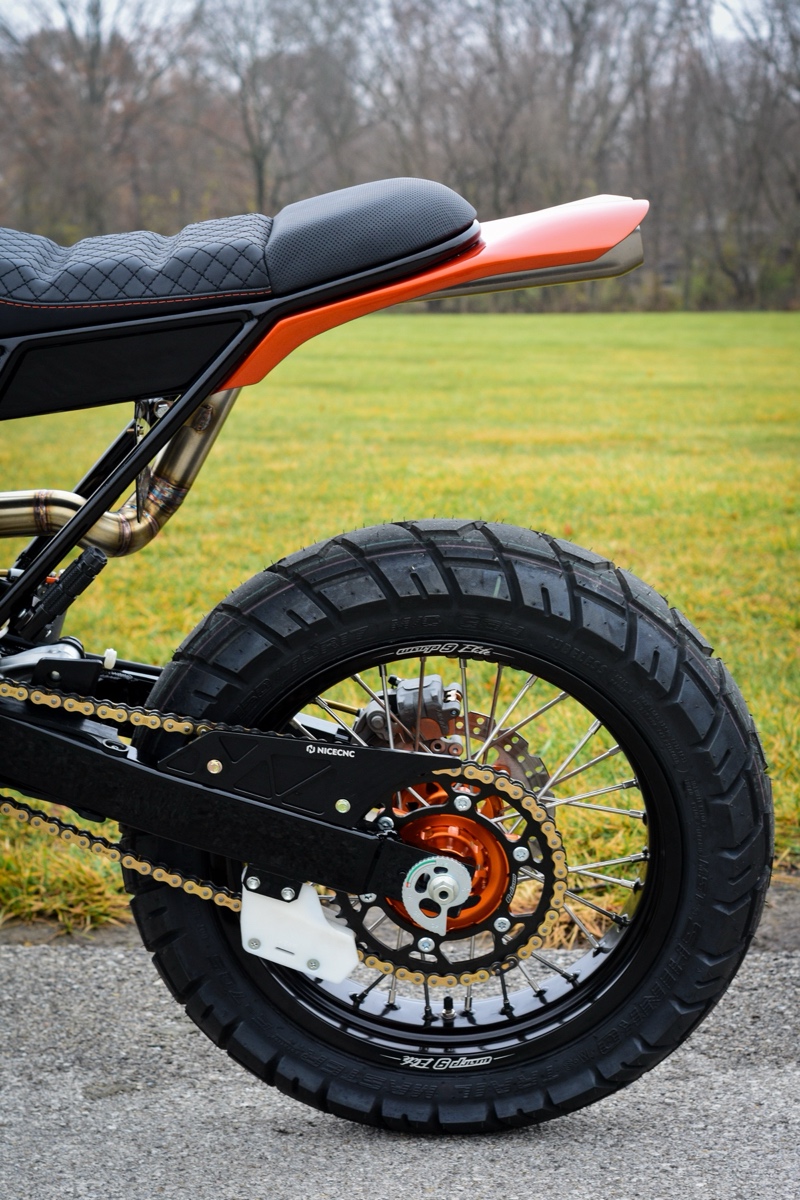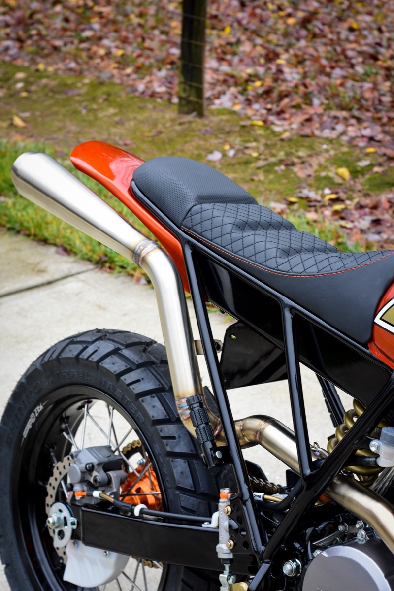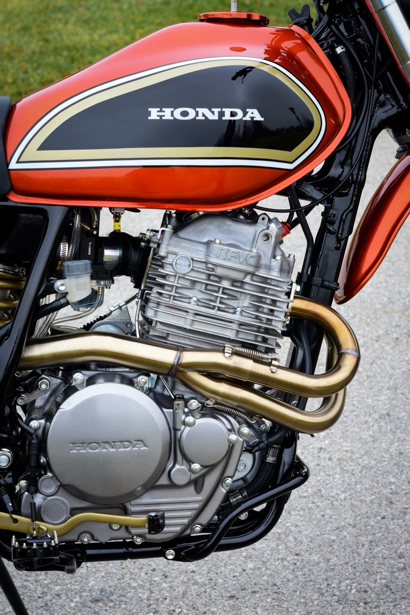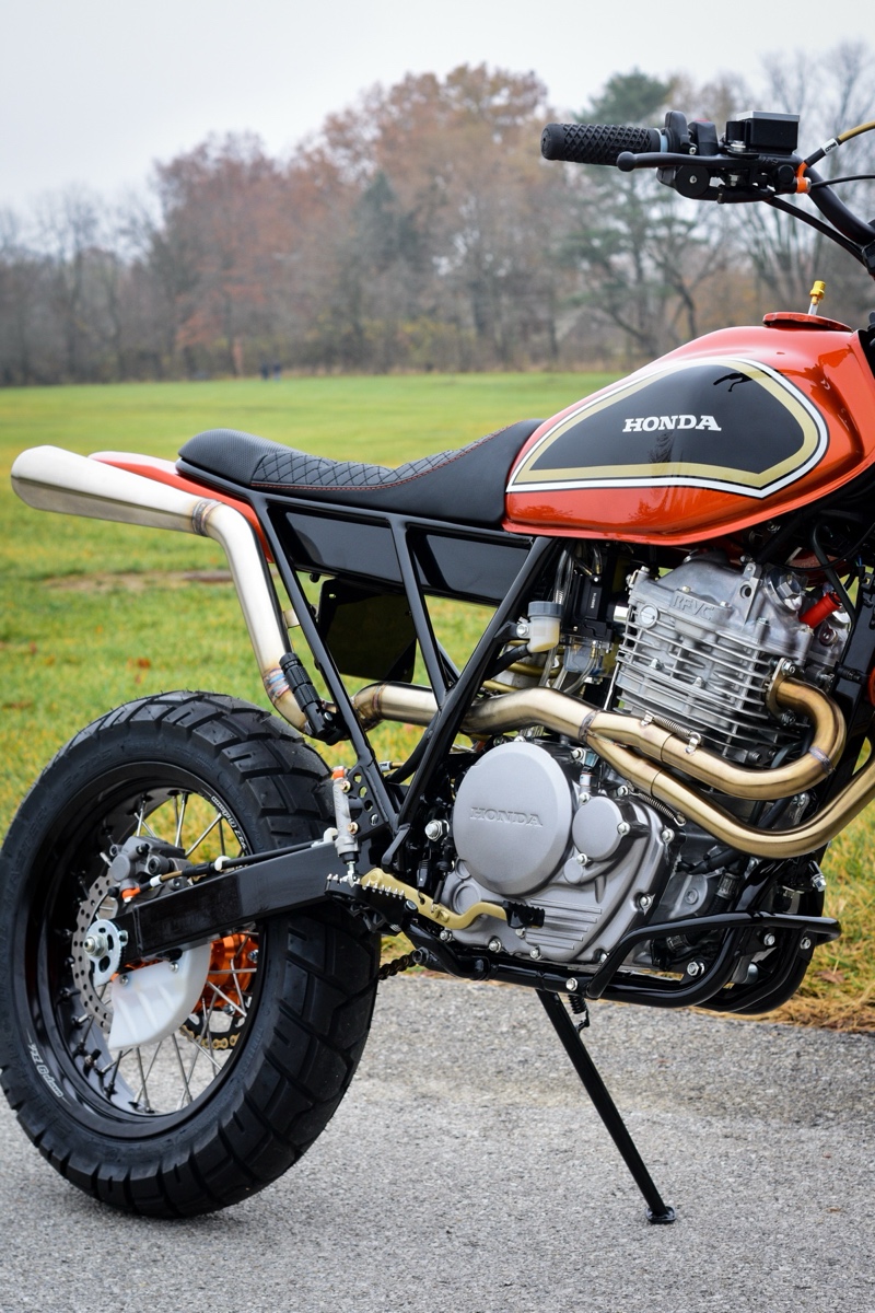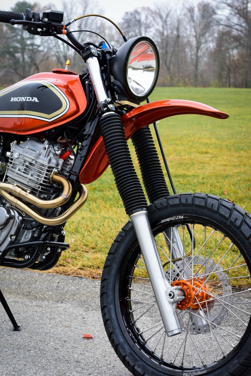 The paint really hits home on the nostalgia front. It’s Honda’s Flake Sunrise Orange, like you’ve seen on many a 70s CB, shot by Hired Guns Paint. The result is a long-legged retromod scrambler that like we wished the factories would build. Fortunately, we have builders like Spencer to make such machines a reality.