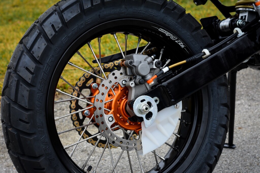 Once the tank and subframe were complete, I moved to the front of the bike. We spoke about whether to do a CRF fork swap but soon decided to keep the stock forks. Since we kept the stock forks and swingarm, I reached out to Warp 9 and they hooked the build up with a 19”/17” wheel setup wrapped in Shinko 705 tires.