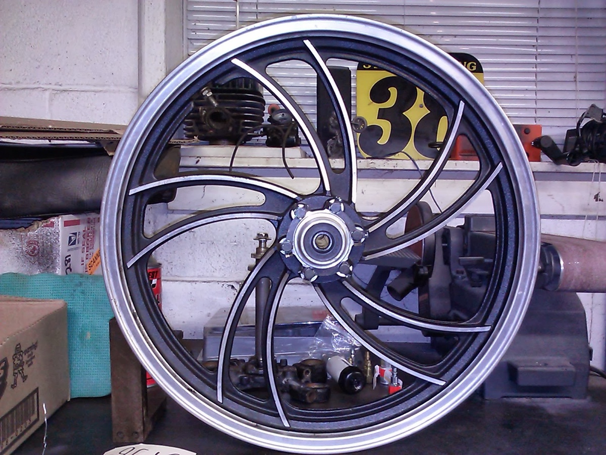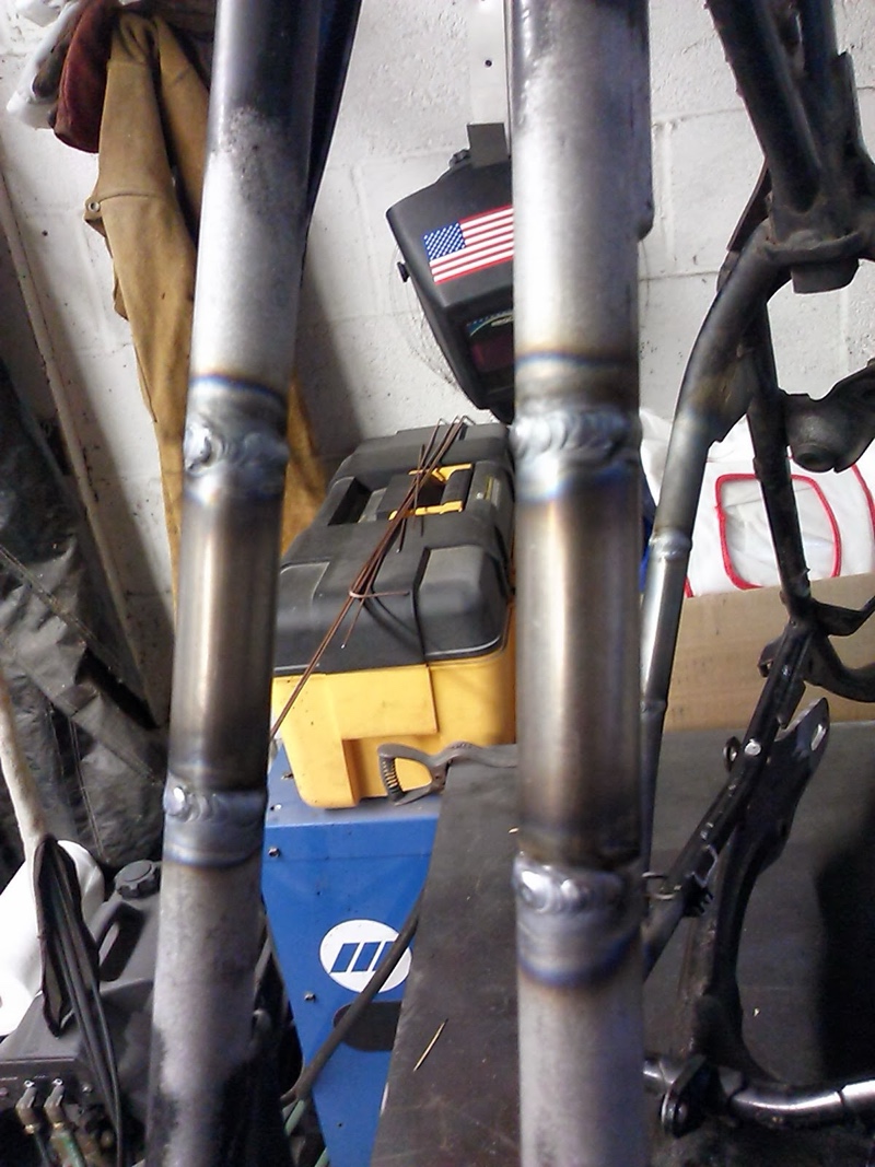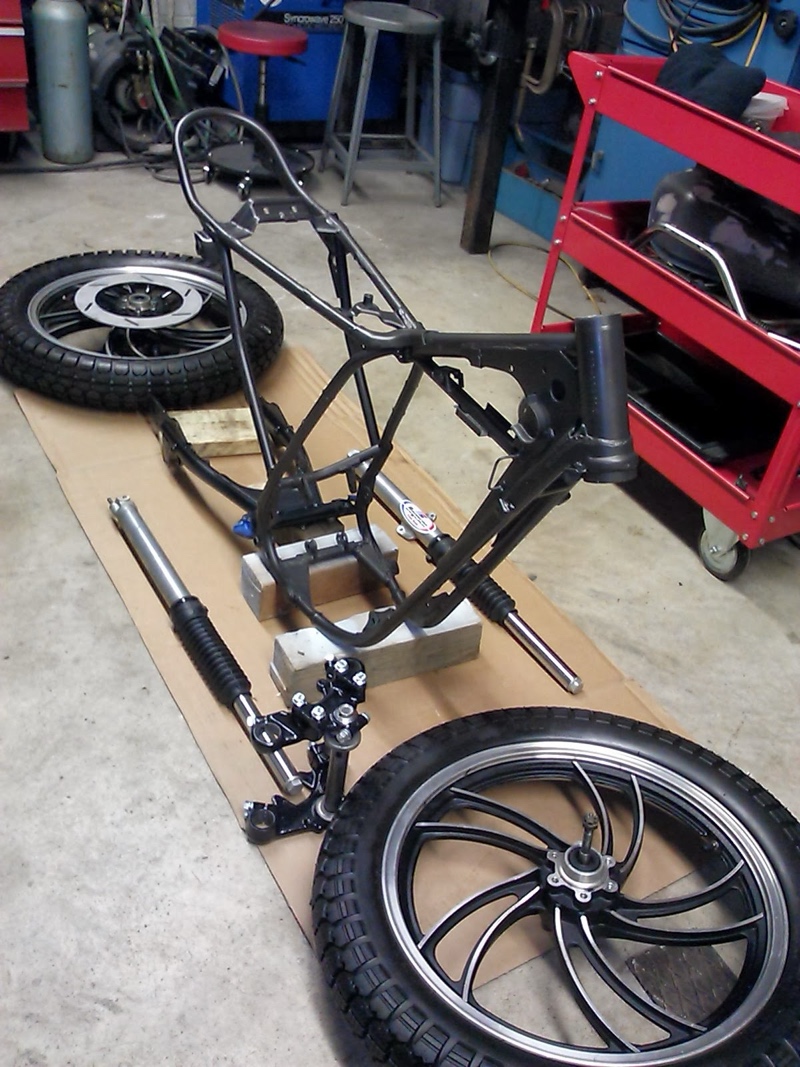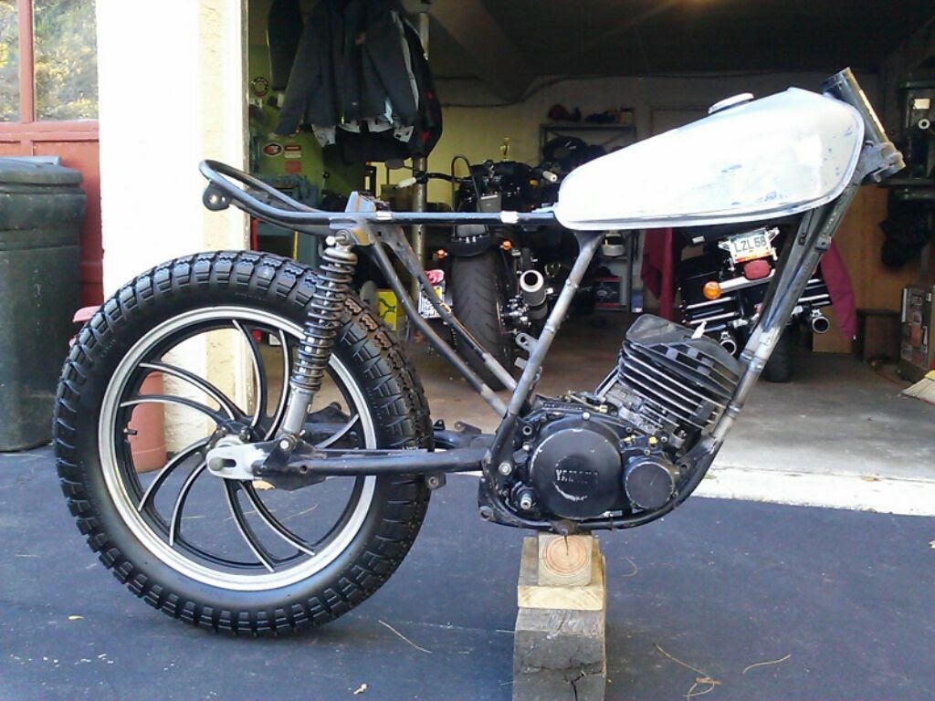 The wheels are off a Yamaha XT and the tires are some old Pirellis I had. The front forks are off of a Honda XL250.