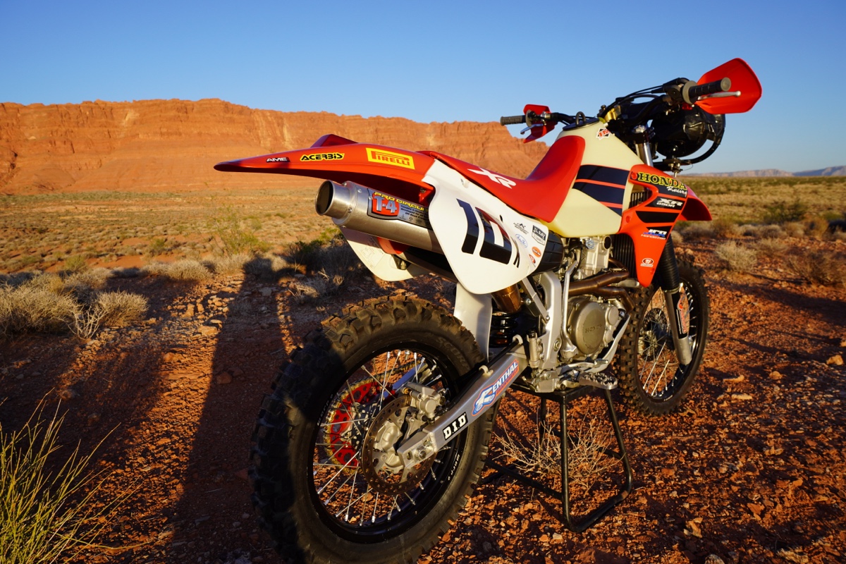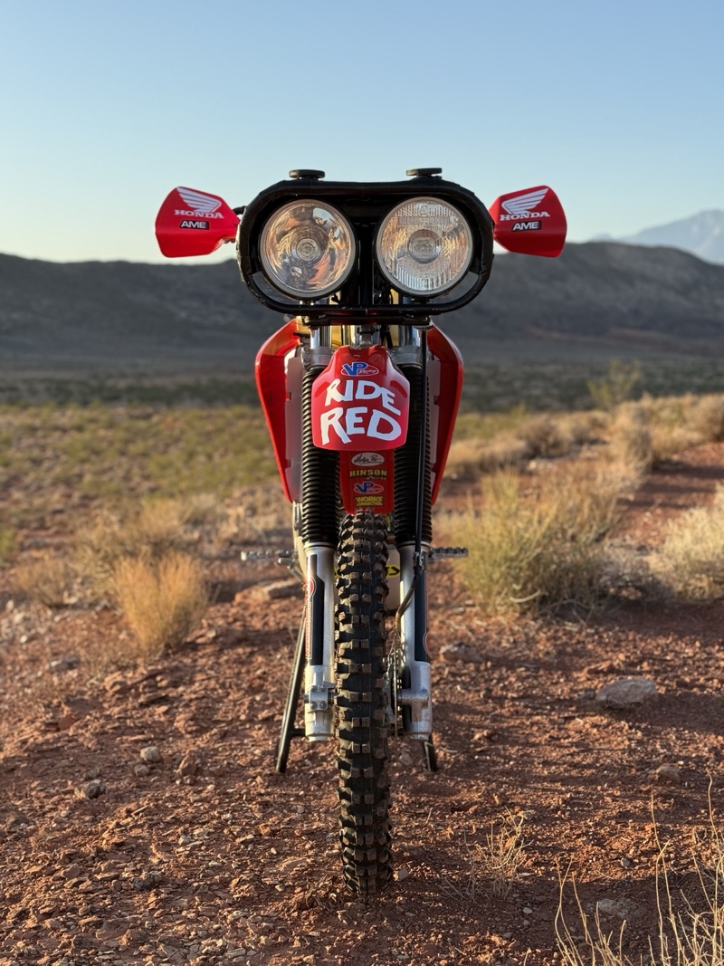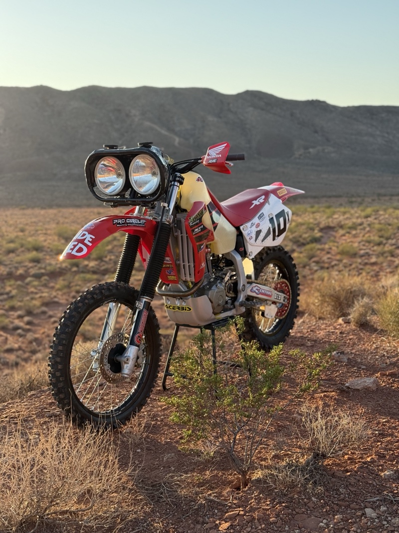 A lot of people say the XR650R is one of the best bikes ever built. They aren’t wrong, it’s big, solid, and a perfect desert sled, it eats the whoops and roads. If you want to trail ride with it, it gets a little heavy. But for an open desert smasher it’s awesome.