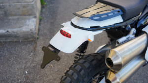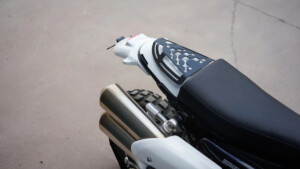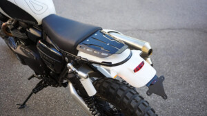 The second major piece was the seat system. We developed the Alps Edition Seat System, which allows you to change the look of the seat in minutes with the possibility to ride with one seat and a luggage rack or with a two-seater. Influenced by the old Dakar bikes.