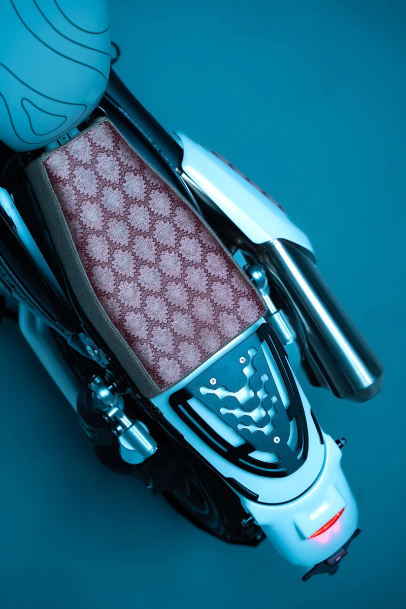 The second major piece was the seat system. We developed the Alps Edition Seat System, which allows you to change the look of the seat in minutes with the possibility to ride with one seat and a luggage rack or with a two-seater. Influenced by the old Dakar bikes.