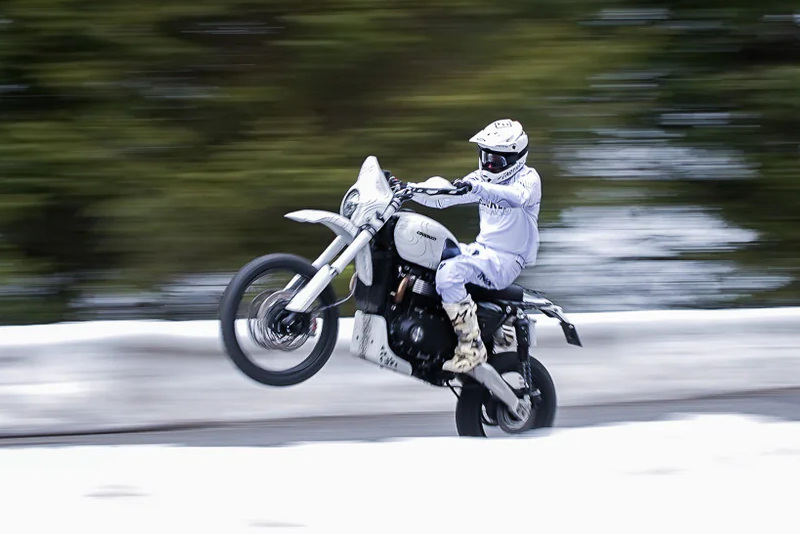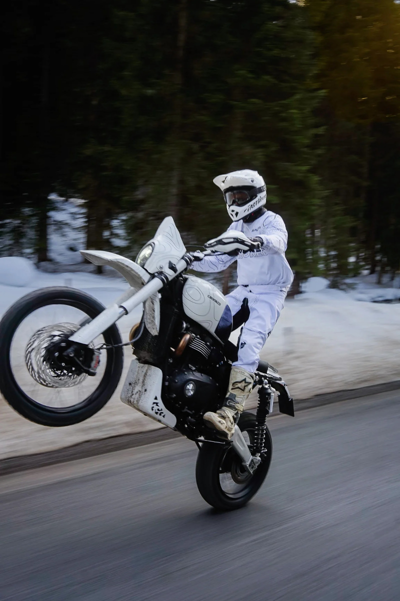 We teamed up with Triumph in the beginning of the year and the Scrambler was always a bike we dreamed of. It’s just a great bike to ride on and off-road — we did a lot of things with this bike including some long wheelie sessions in the mountains with snow.