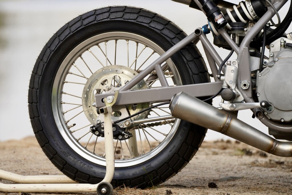 Janne built the frame and swingarm from Docol R8 steel tubing, mainly using Indian FTR750 geometry, and outfitted the chassis with Kawasaki ZX-9R and ZF-Sachs rear suspension. Interestingly, Finland allows front brakes on flat track bikes, so there’s a small disc up front and big four-piston Brembo caliper in the rear.