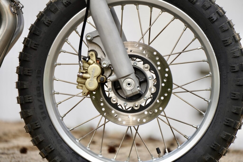 Here in Finland front brake use is allowed, so minimal disc is mounted in front too. In the rear a bigger one is in use, with four-piston Brembo caliper.