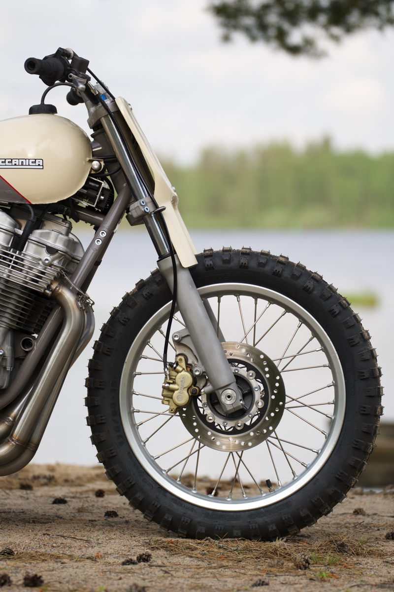 Here in Finland front brake use is allowed, so minimal disc is mounted in front too. In the rear a bigger one is in use, with four-piston Brembo caliper.
