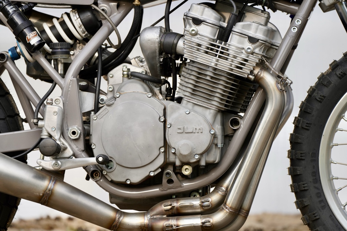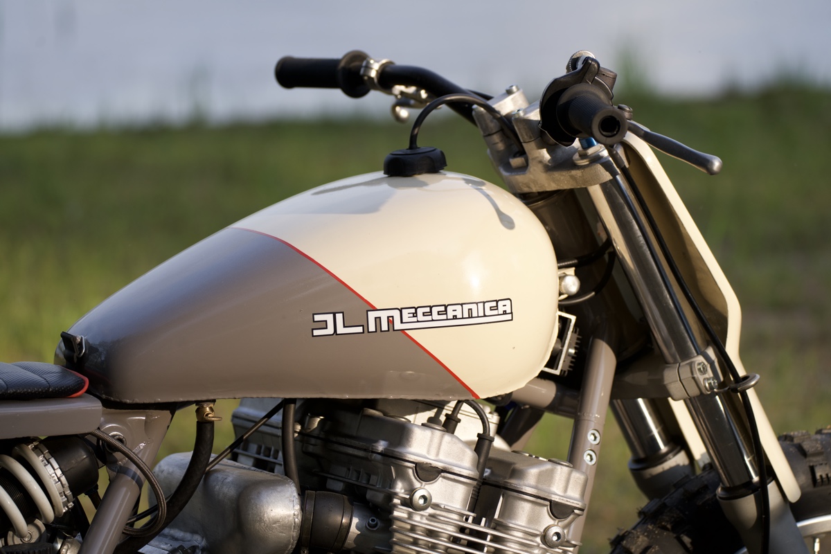 The bodywork is made from fiberglass, and the tank comes from an unknown custom bike, modified to fit the frame backbone and an Acerbis fuel cap.
