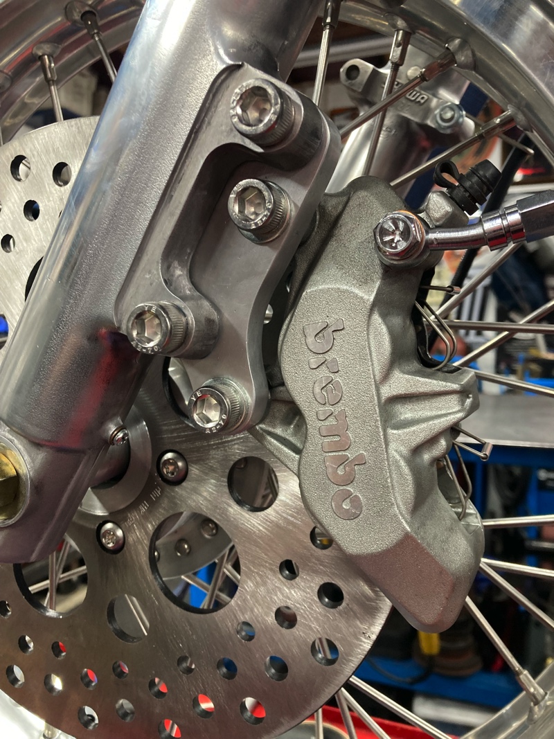 - Brembo / Ducati four piston calipers out front, 2016 Sportster rear caliper, braided hoses .