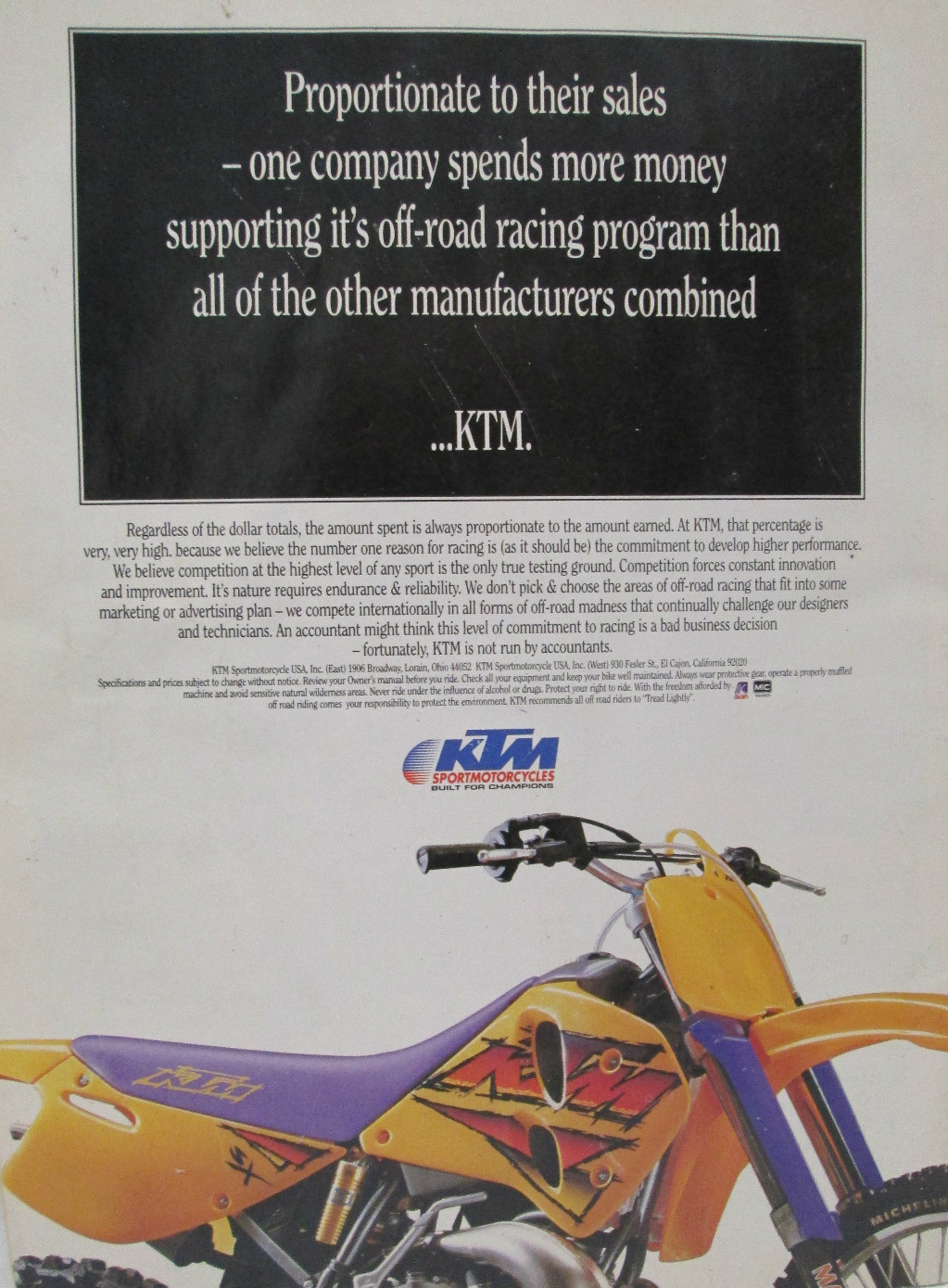 “The bike holds its own, pretty impressive for a frame that has the tabs to hold a centerstand — it’s the same as the enduro bike’s. The SX’s power spread is broad and easy to ride. It pulls well off the bottom, has a healthy midrange punch and plenty of over-rev…” –Cycle World, 1991
