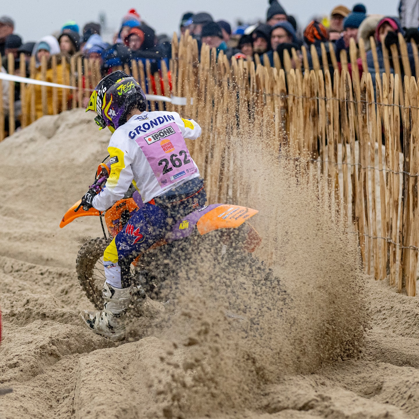 The ’96 KTM 250 SX you see here is one special smoker indeed. It’s the race bike of 2024-25 French Sand Motocross Championship Vintage Champion (and 2025-26 Vice-Champion) Jessie Grondin. The Championnat de France des Sables Motoblouz (CFS) is an elite winter series featuring grueling endurance races on sand, with the final round at Enduropale du Touquet — said to be the world’s largest, most prestigious beach race (Jessie has finished 2nd twice here in the Vintage class).